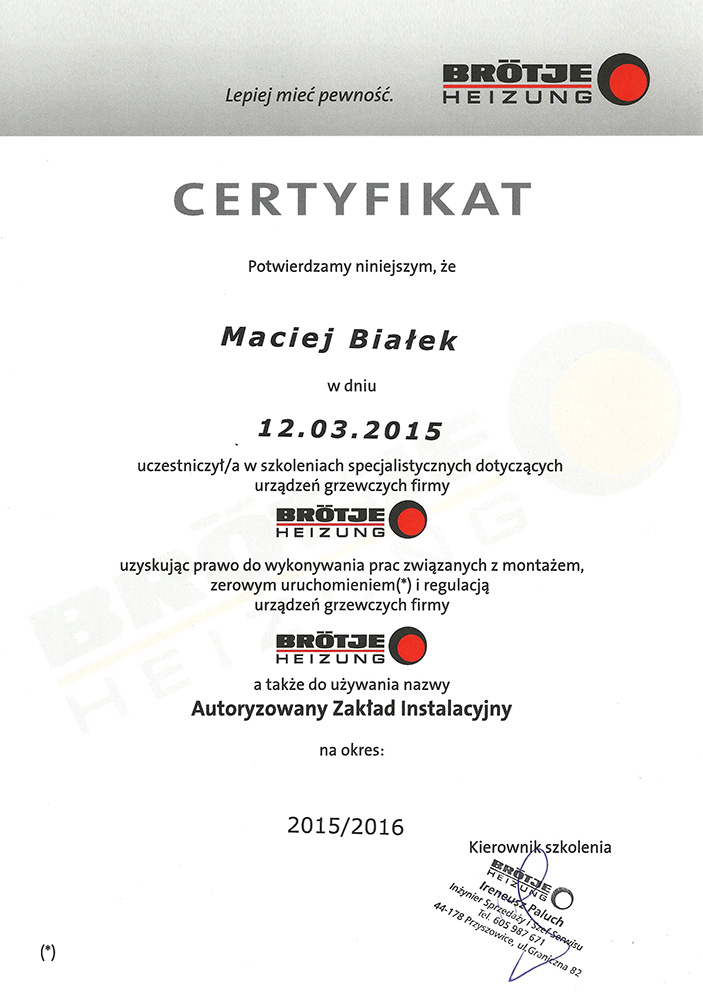 Certyfikat firmy BROTJE HEIZUNG