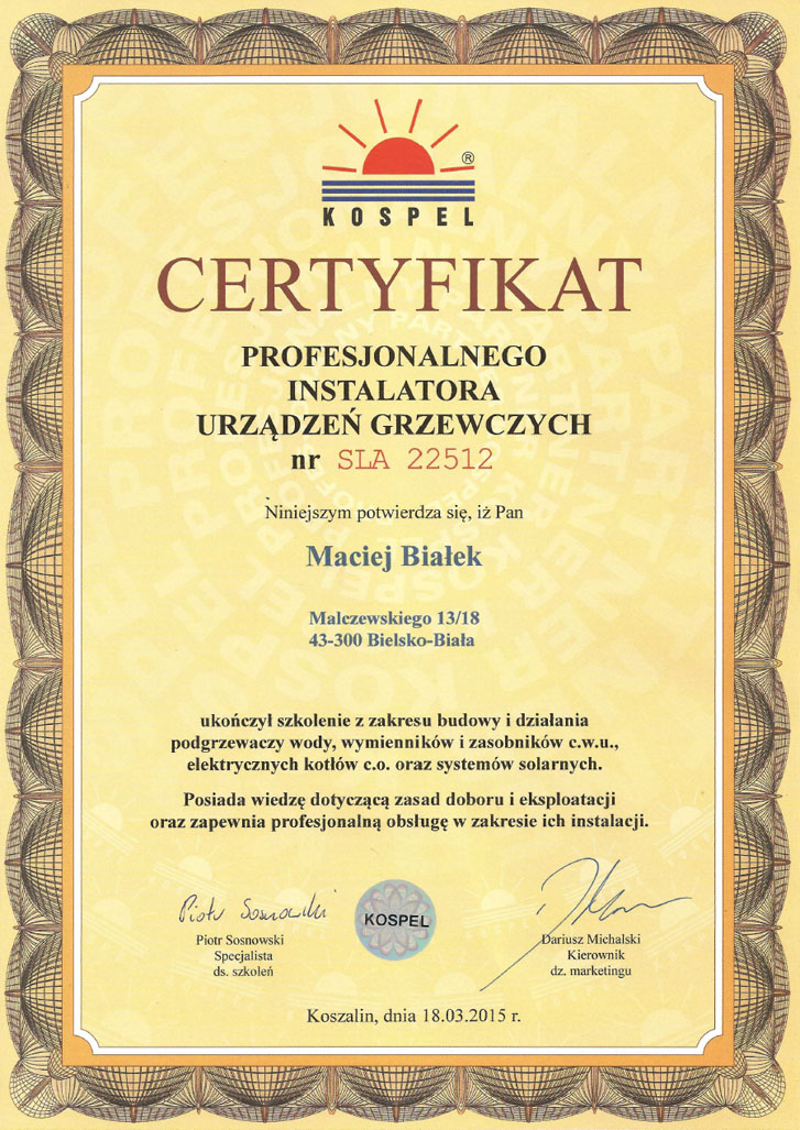 Certyfikat firmy KOSPEL